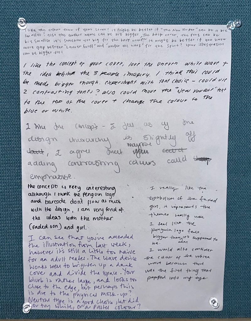 I learned about the types of typefaces typically used for making books and how to use elements from the story to design book covers. I realized that considering the target readers is crucial for creating a suitable design for them. Moving forward, I will continue to focus on how to create appropriate designs for target clients and produce works that meet their needs.