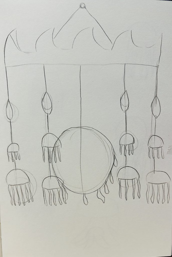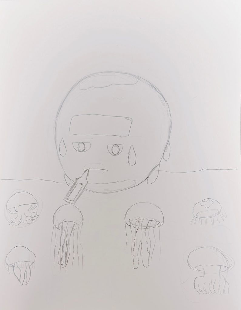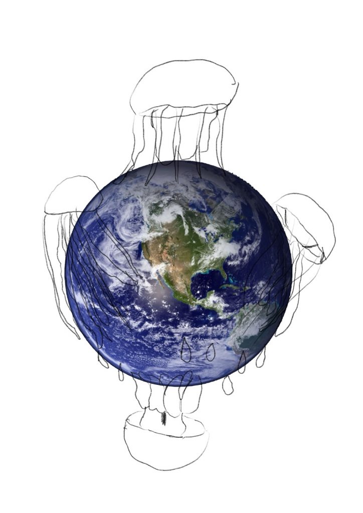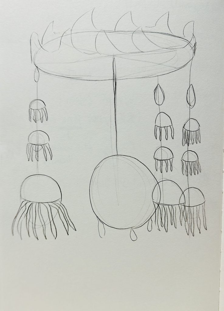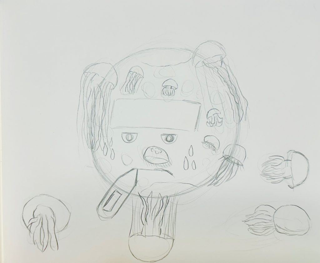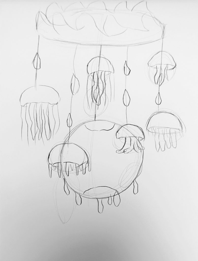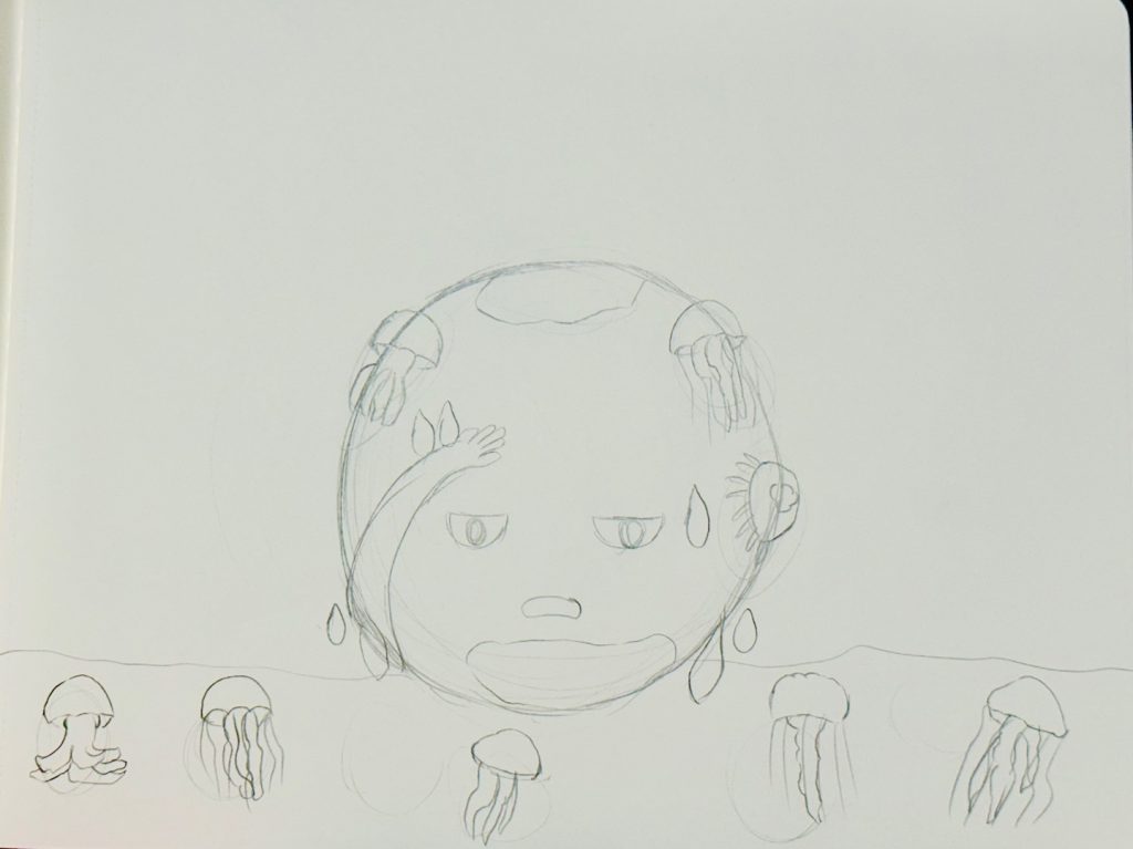 I drew more idea sketches to express climate change with the Earth and jellyfishes. I tried to show the face expression on the Earth looked like it has a serious problem(increasing temperature) as suffering from high fever. And jellyfishes were stuck to the planet to show the number of them were increasing because the water was getting hotter. I thought it could be intriguing work if I express the Earth like a character. And I thought creating them as mobile(hanging craft) could be interesting, but I thought I have to find better idea as drawing more one.