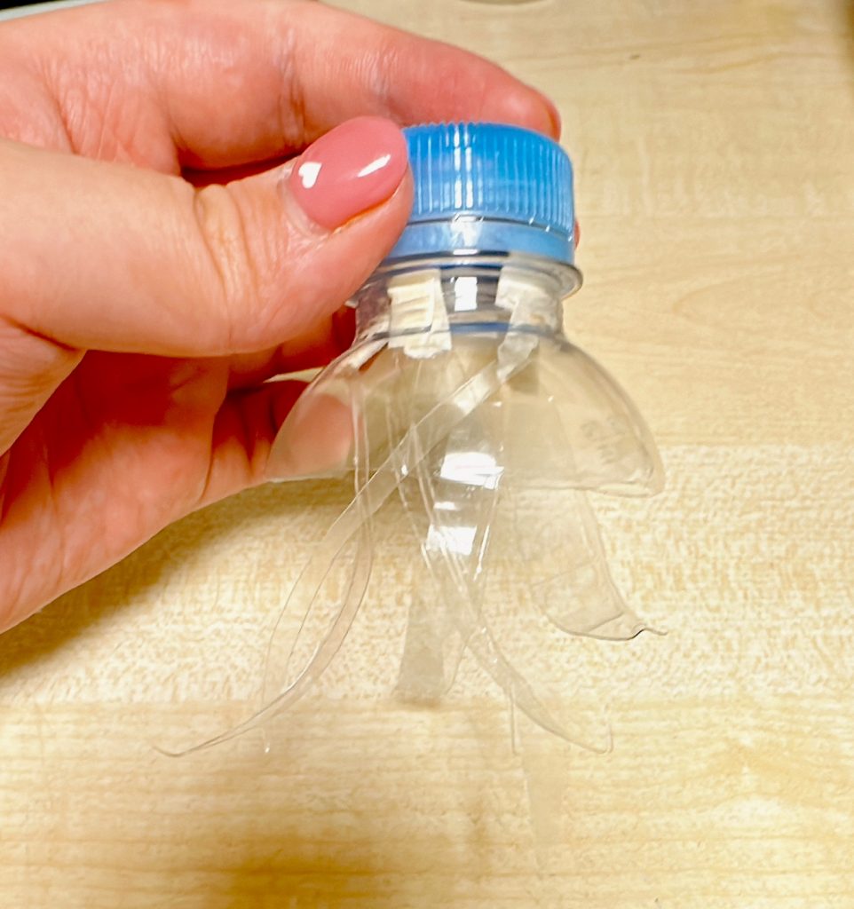 I tried to create the part of oral arms with plastic bag. Before I did, I guessed it would be useful for expressing that body as changing the figure easily. But, While I was making, I figured out it was also too weak to make the shapes. Then, I thought for finding other ways and I decided to cut the body of bottles like oral arms and stick it under the bottom. I realised that there was a easier way to create that part and I would like to try this one with other bottles. Also, I guessed it would be more similar to jellyfishes if I add fishing lines on that work. And I would like to find more methods for expressing oral arms while I made more experiments.