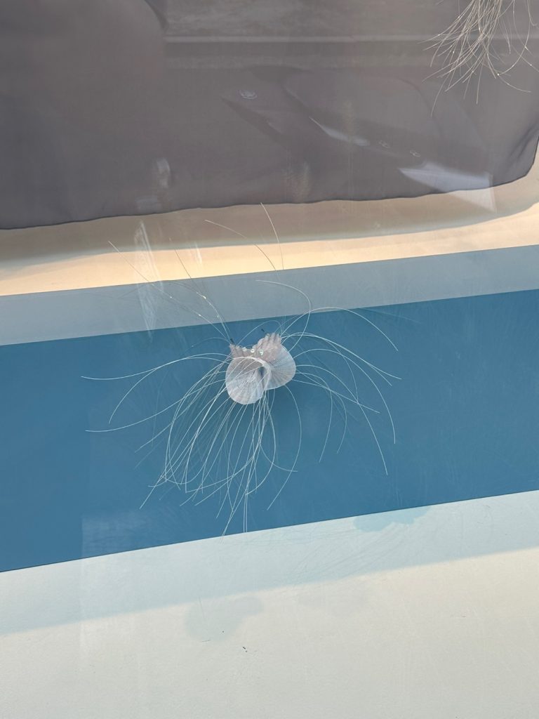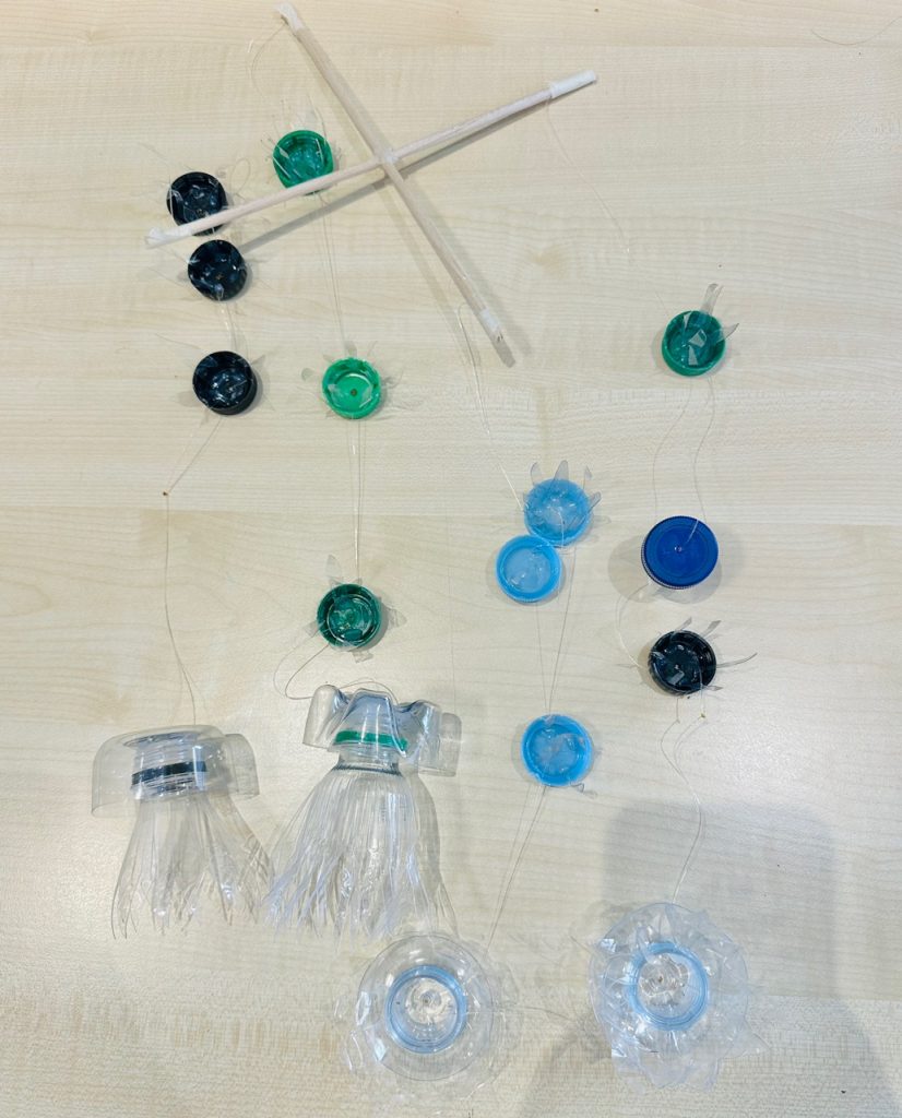 I tried hanging my jellyfish crafts using fishing lines, but I found it difficult to make holes in them using just sharp tools like scissors or an awl. Then I realised that heating the awl would make the process much easier. I also thought it would look nice if I hung them uniformly along the line. However, it turned out to be challenging to arrange them neatly all at once because the spacing became uneven, which disrupted the overall look. Initially, I planned to use a rounded shape for the main body, but the stick broke when I tried to bend it into a circle. So, I decided to experiment with a new shape and also create another hanging craft and Earth one.