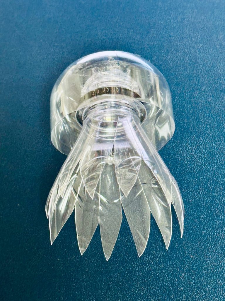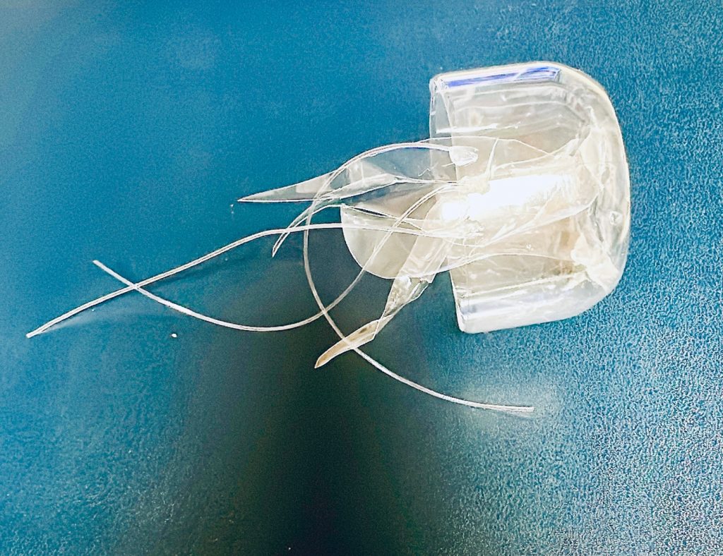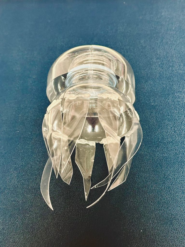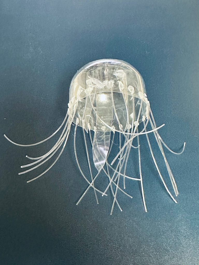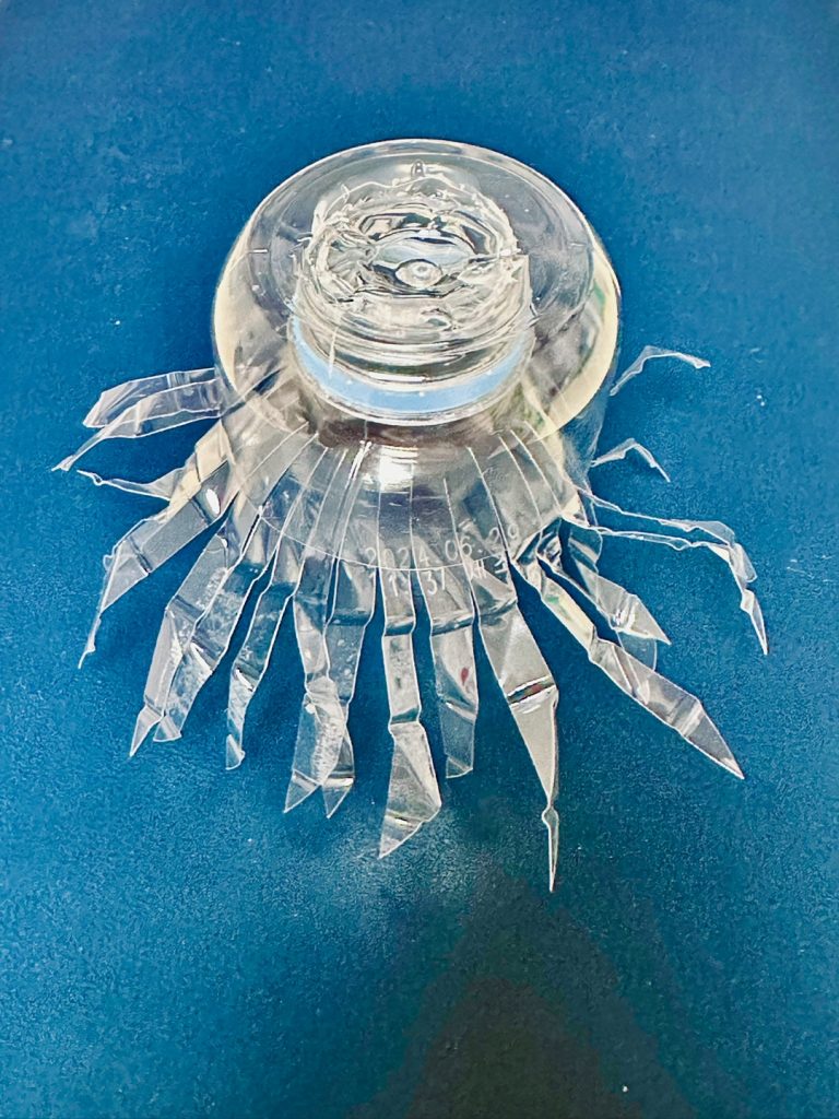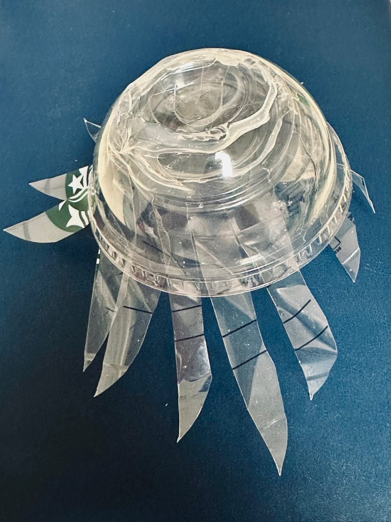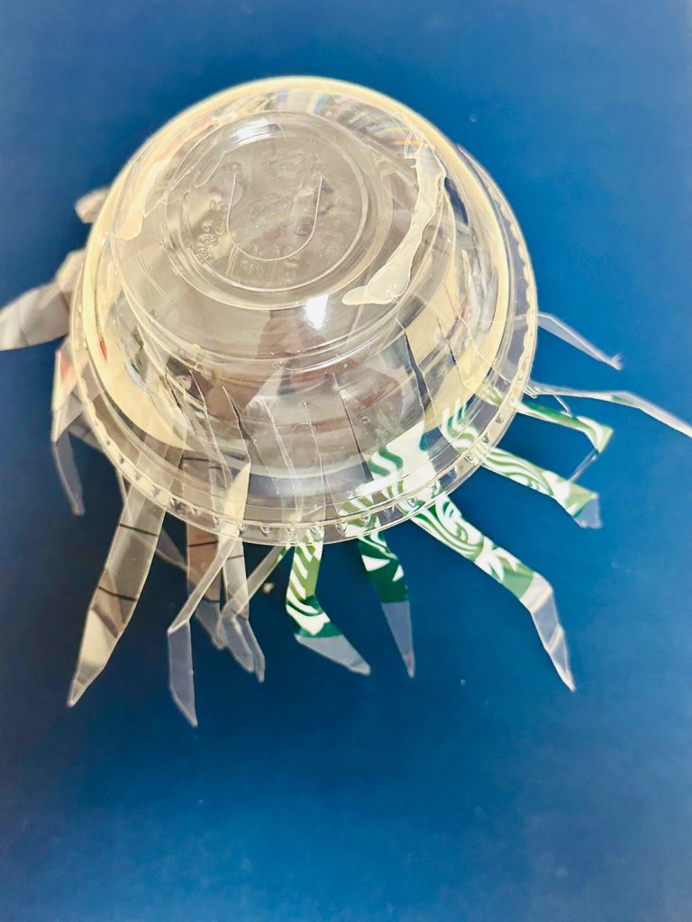 I made other plastic jellyfishes in different ways. I tried to work using plastic cup, and I guessed it was hard to cut and twist it and would be more similar to the jellyfishes if I cut it thinly. And I made another one with the top that I closed the lid and stuck the pieces that were shaped like wave. I realised it was hard to stick the oral arms under the part of head because it was melted easily because of heat from glue gun. But I thought it looked like jellyfishes and it was a good trial. I needed to cut the lines thinner and curved with different figures that be more similar to jellyfishes.