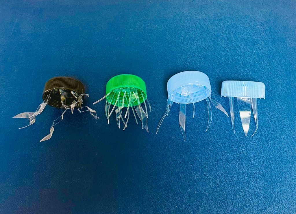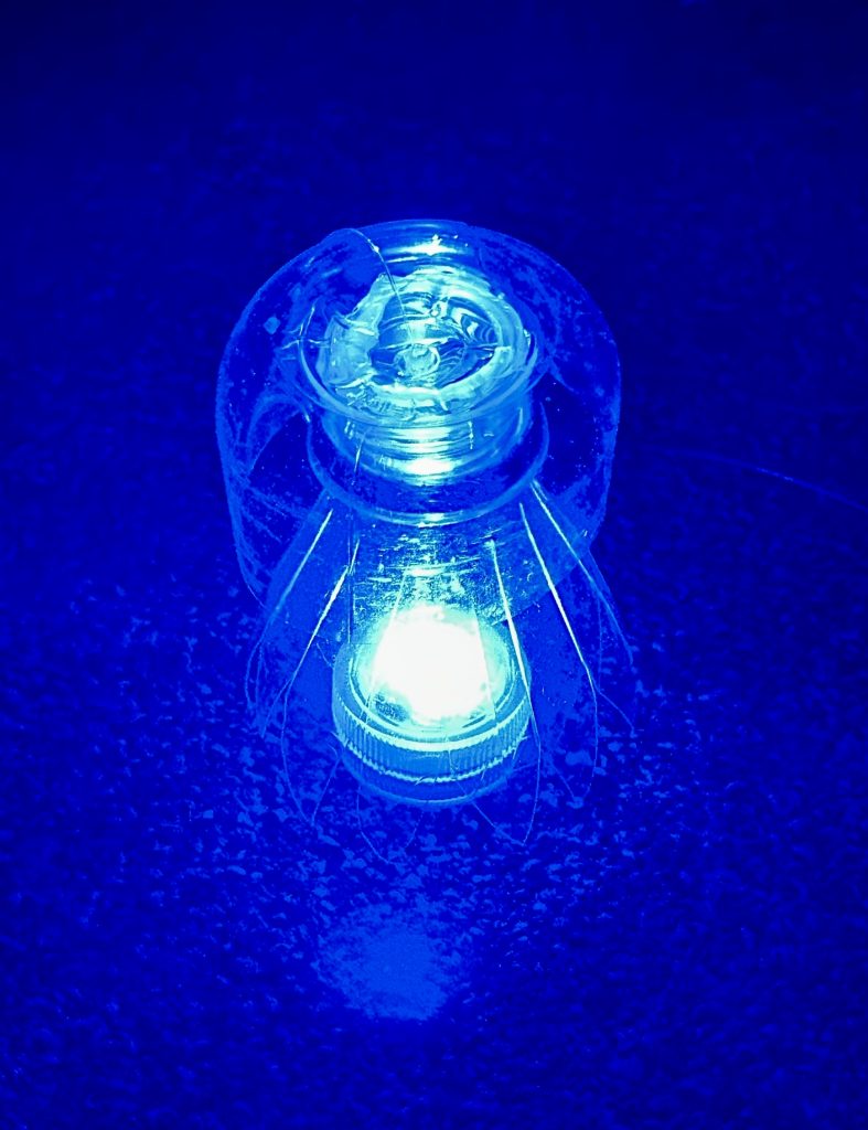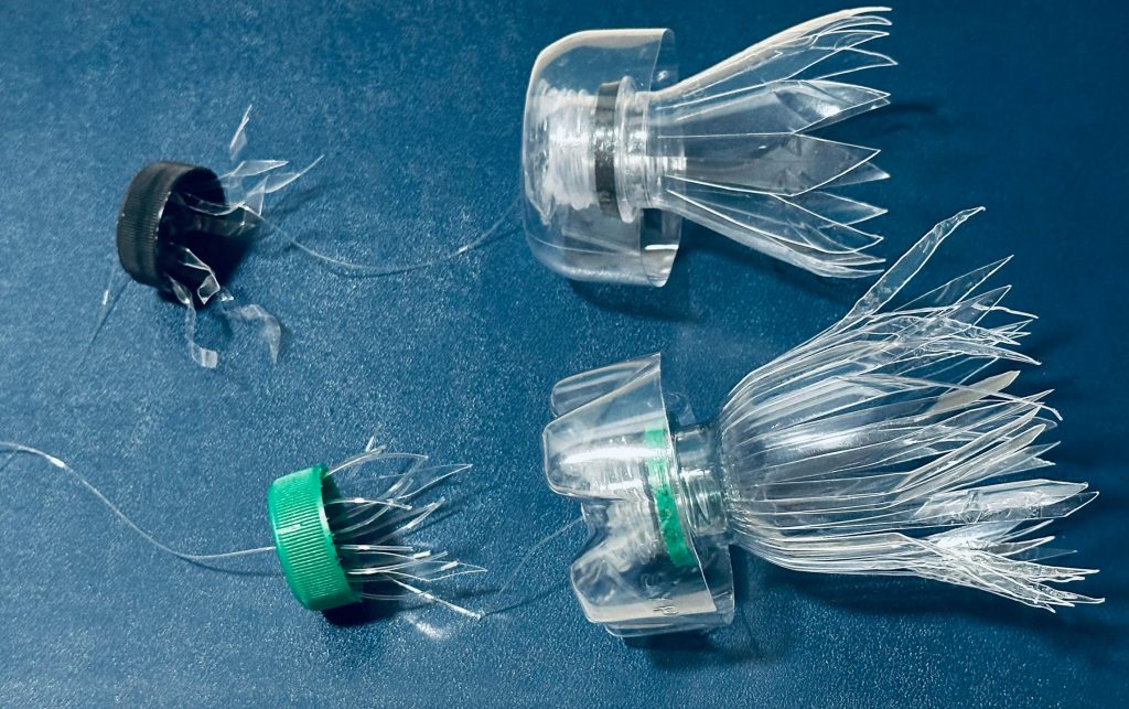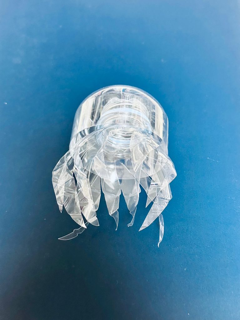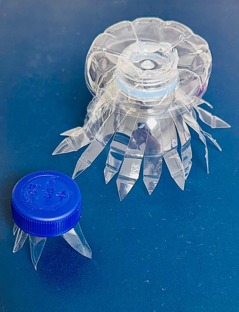 I continued to make new jellyfishes with plastic bottles and fishing lines. When I fished to work, I figured out most of them has similar size, then I thought I need to add a little change on my works. I decided to try to use the lids for creating smaller ones. And I guess it would be a nice trial for creating new jellyfishes. Also, I guessed I could make the outcome as I take pictures them on blue coloured paper for expressing inside of the sea.