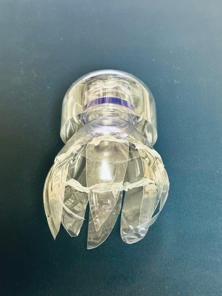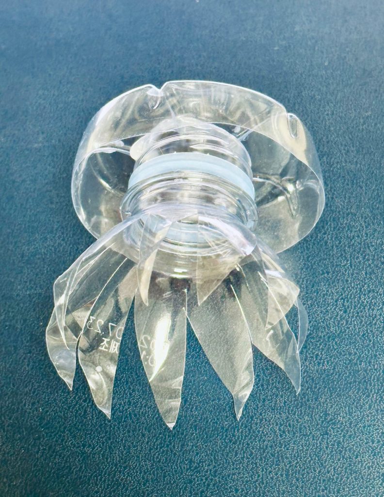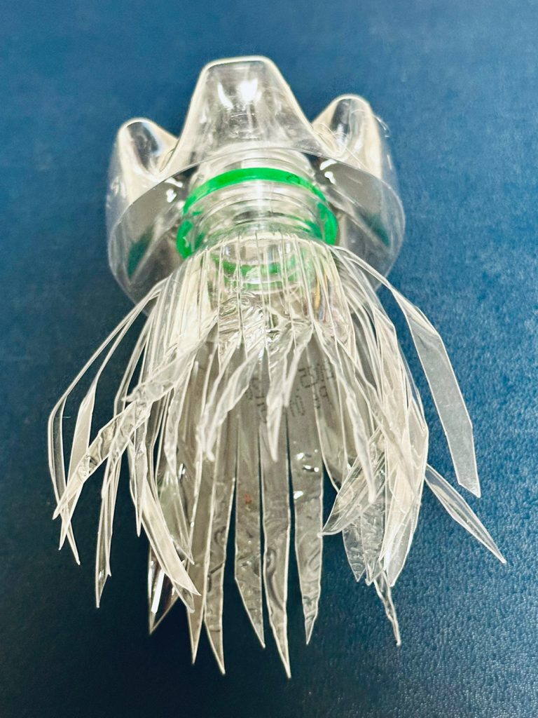 I made other jellyfishes with new bottles and fishing lines. I realised that fishing lines were really helpful for expressing the tentacles and I guessed it would be more similar to a jellyfish if I add a part of oral arms. While I was using a new bottle with different texture, it was quite hard to cut it, because it was tough. But, I thought it was a great trial for creating a jellyfish that has a new style from others. Also, I was excited that I could mixed different kinds of things with different texture or shapes. I expected that I could make unique one as I used other bottles or combined them.