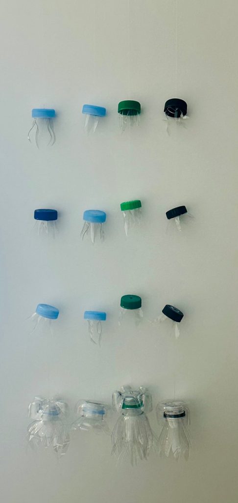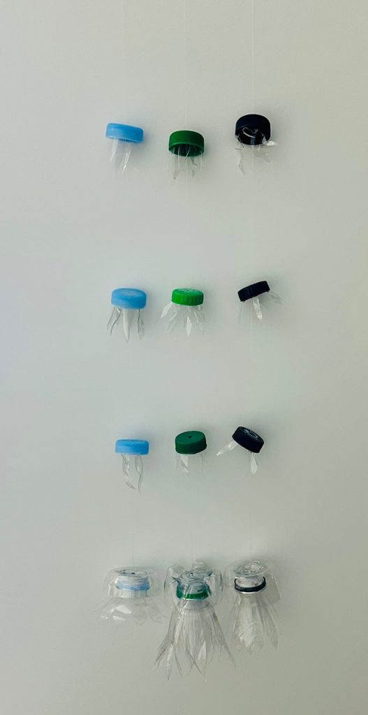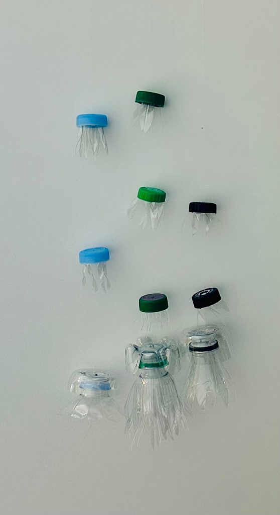 I found some new inspirations through taking a stroll and visit a museum. When I went to a gallery, I watched hanging crafts that was made with glass. Through these works, I thought it would become a great one if I made as a mobile when I finished to make plastic jellyfishes. And I also saw impressive works that were displayed in another gallery. When I watched these works, I figured out it has freewheeling lines with strings, so I would like to try to make the tentacles using plastic strings like fishing lines. And I thought I have to remember to use reusing products mainly for showing the importance of recycling and its various impacts on both humans and nature.