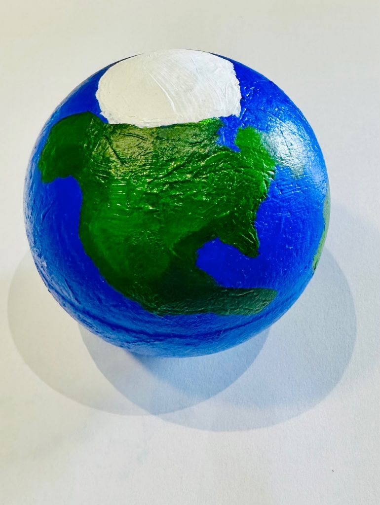 I painted the Earth and used a glue gun to create sweat drops to express climate change. I realised that painting a three-dimensional planet was really difficult because most references don’t show the entire globe at once. Eventually, I found it easier to refer to a world map while working on the Earth. It made me appreciate how vast and complex our world is. I also thought that using a glue gun to create sweat drops was a good idea because the heated glue becomes liquid, resembling sweat when it melts. However, I discovered it wasn’t easy to work with, as the glue often stuck to paper or other surfaces and didn’t turn out as neat as I wanted. Despite this, I still plan to use this technique to create more sweat figures.